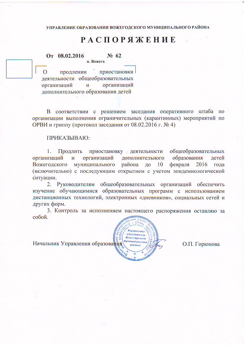 Распоряжение о приостановлении деятельности общеобразовательных организаций и организаций дополнительного образования детей.