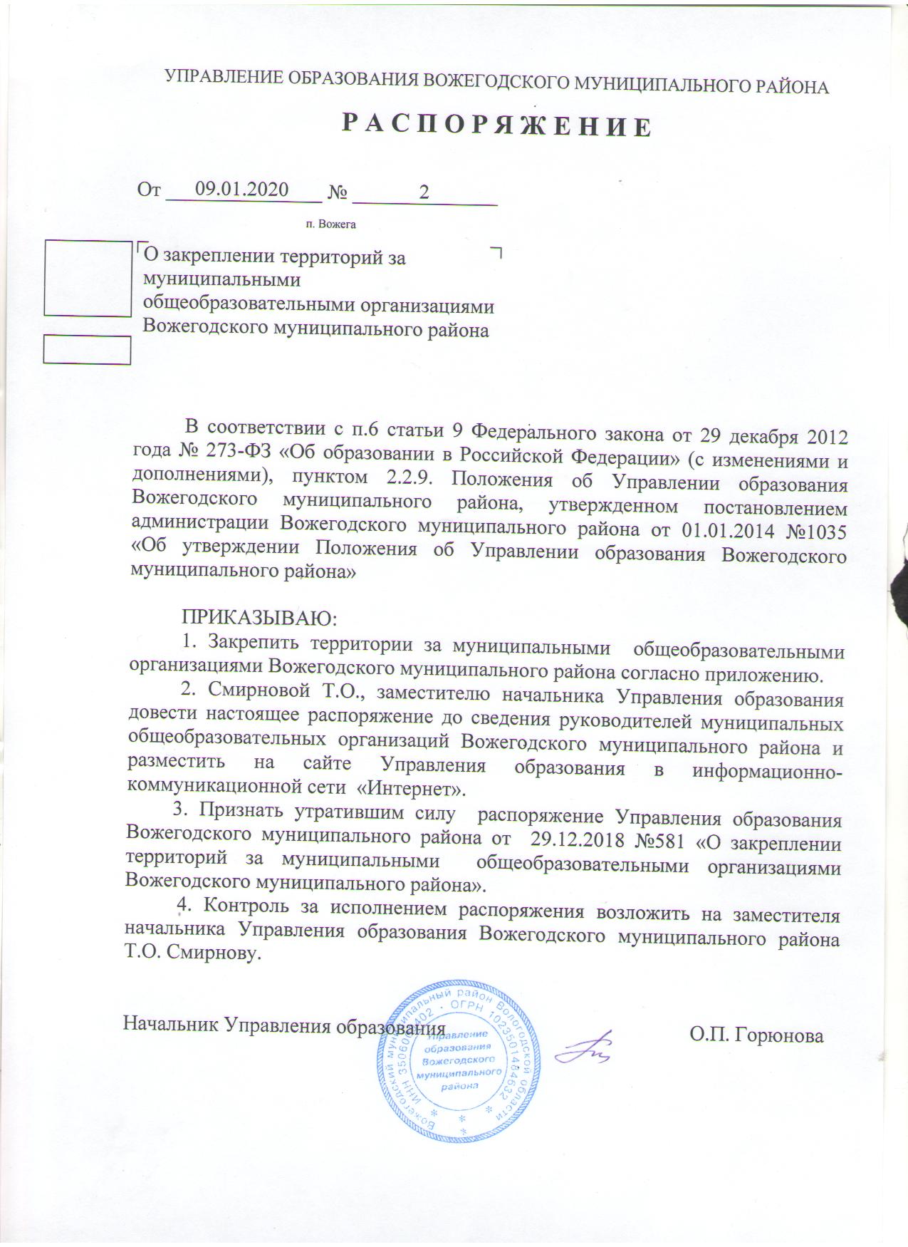 Зачисление в первый класс осуществляется по территориальному принципу. За каждой школой закрепляется определенная территория (распоряжение Управления образования Вожегодского муниципального района от 09.01.2020 №2 «О закреплении территорий за муниципальными общеобразовательными организациями Вожегодского муниципального района»).