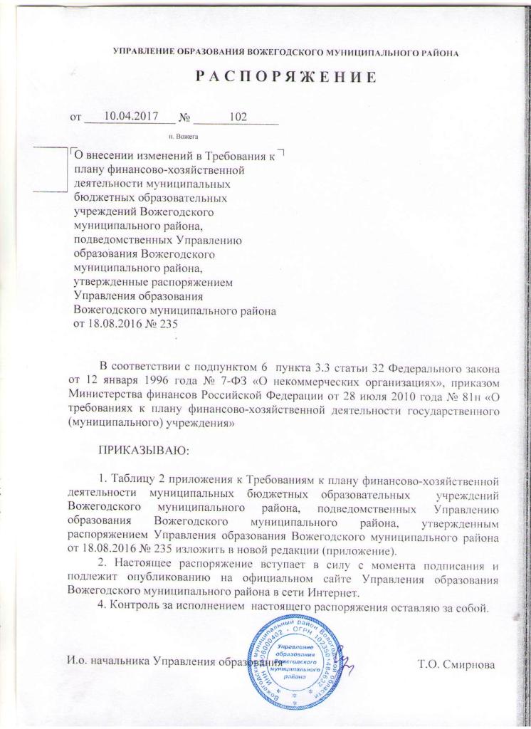 Распоряжение от 10.04.2017 № 102 О внесении изменений в требования к плану ф-х деятельности