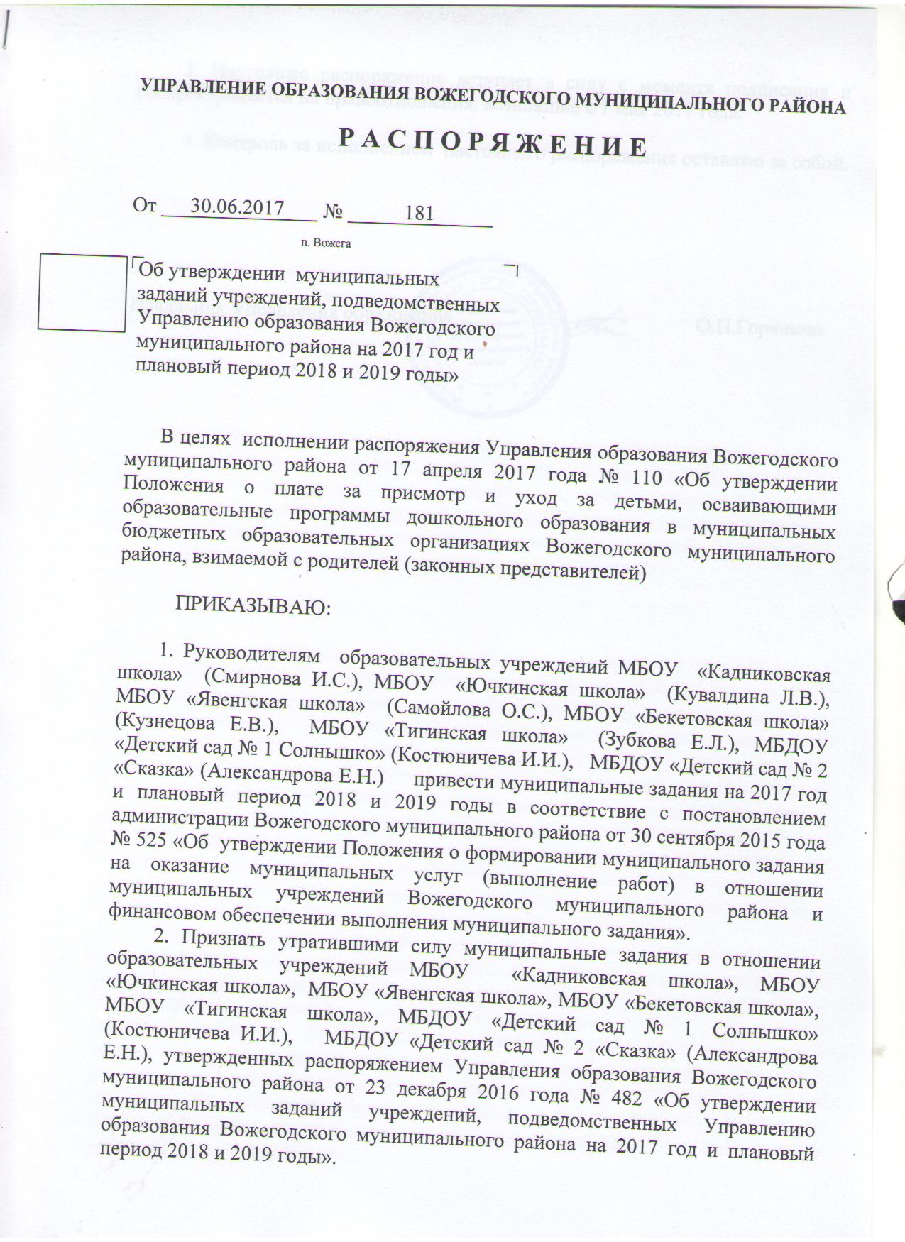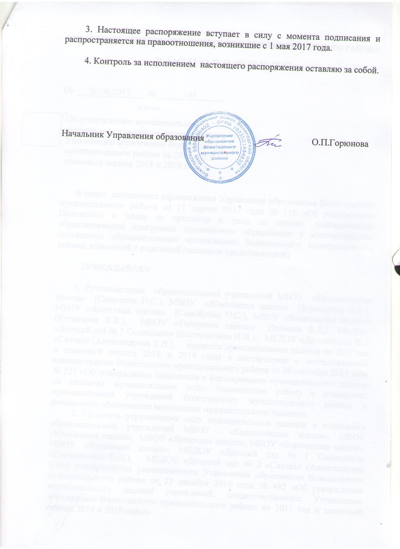 Распоряжение № 181 от30.06.2017 Об утверждении муниципальных заданий