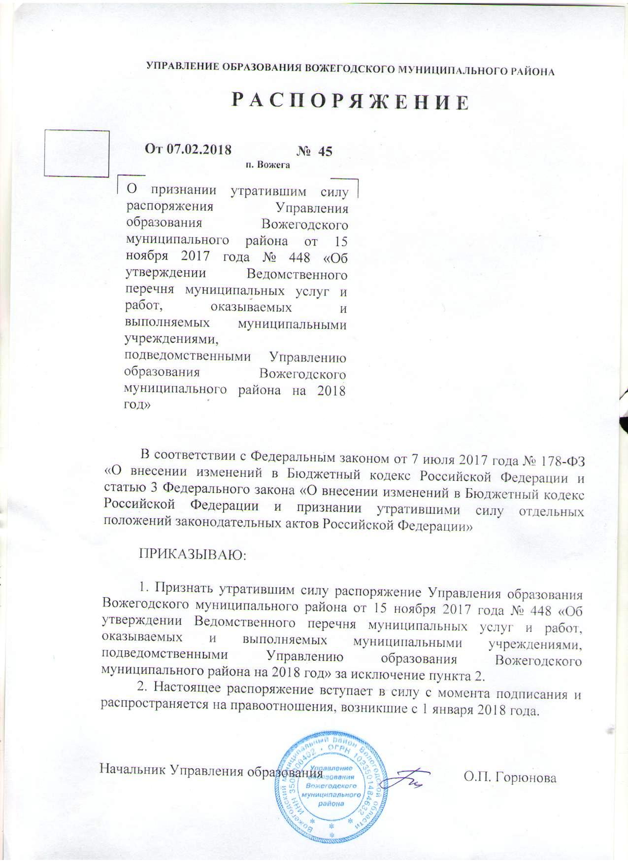 Распоряжение от 07.02.2018 № 45