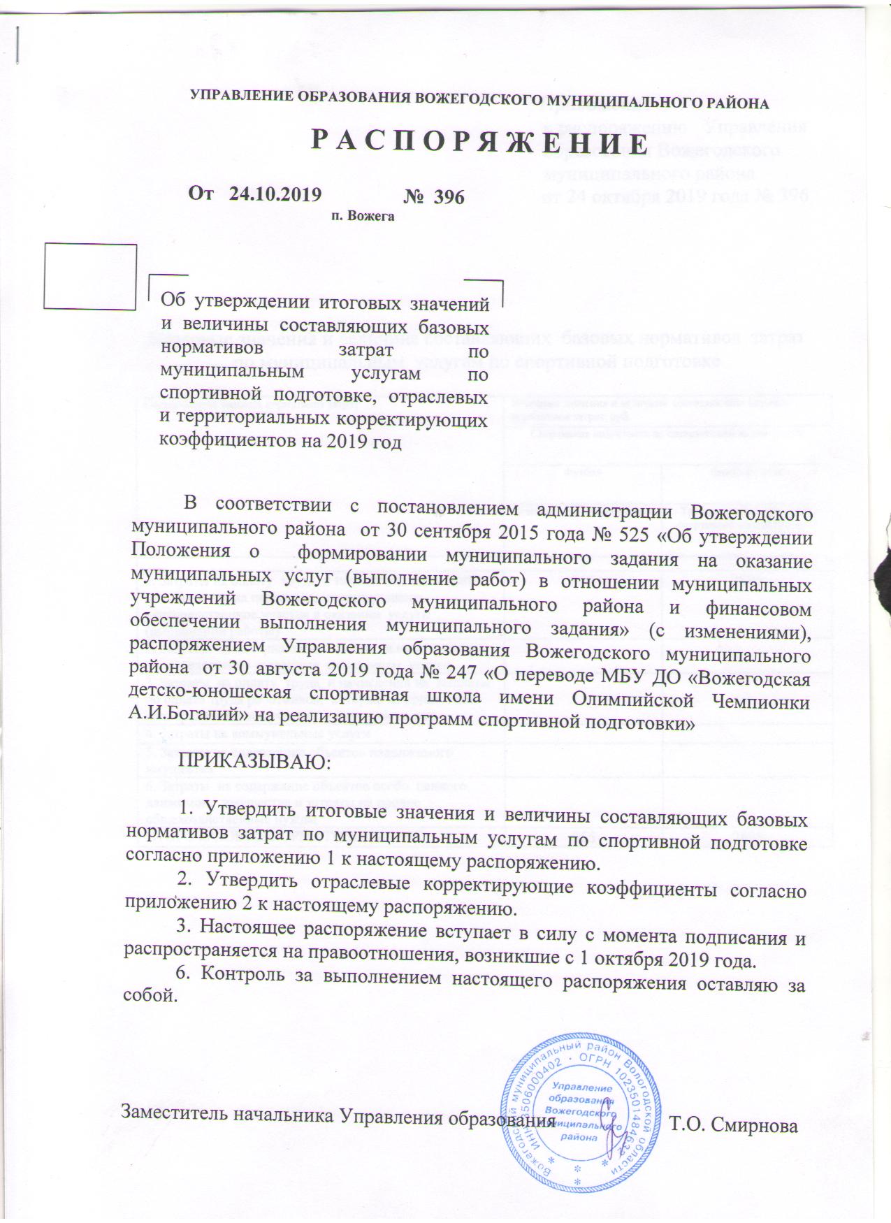 РАСПОРЯЖЕНИЕ ОТ 24.10.2019 № 396