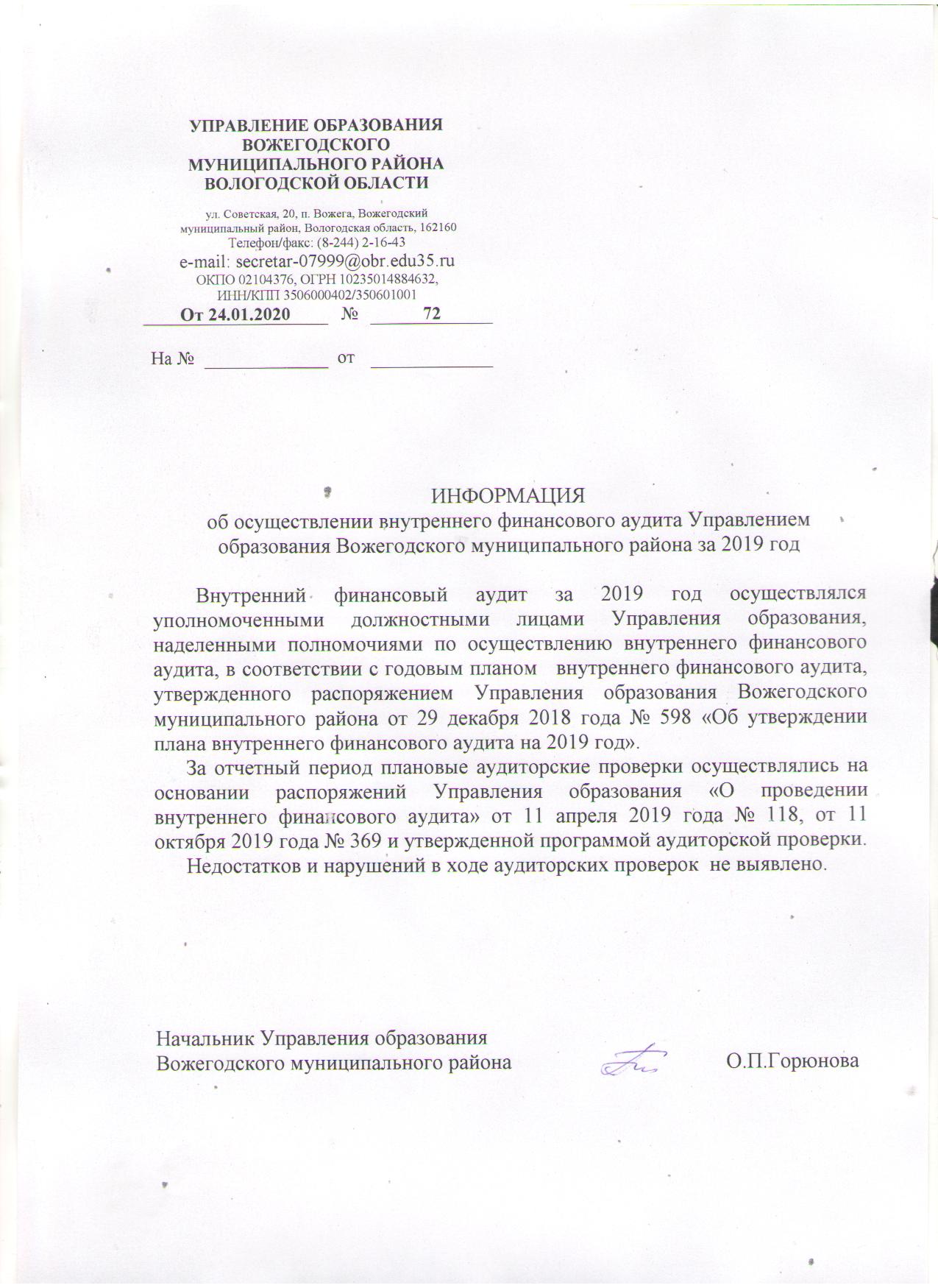 Информация об осуществлении внутреннегго финансового аудита УО за 2019 год