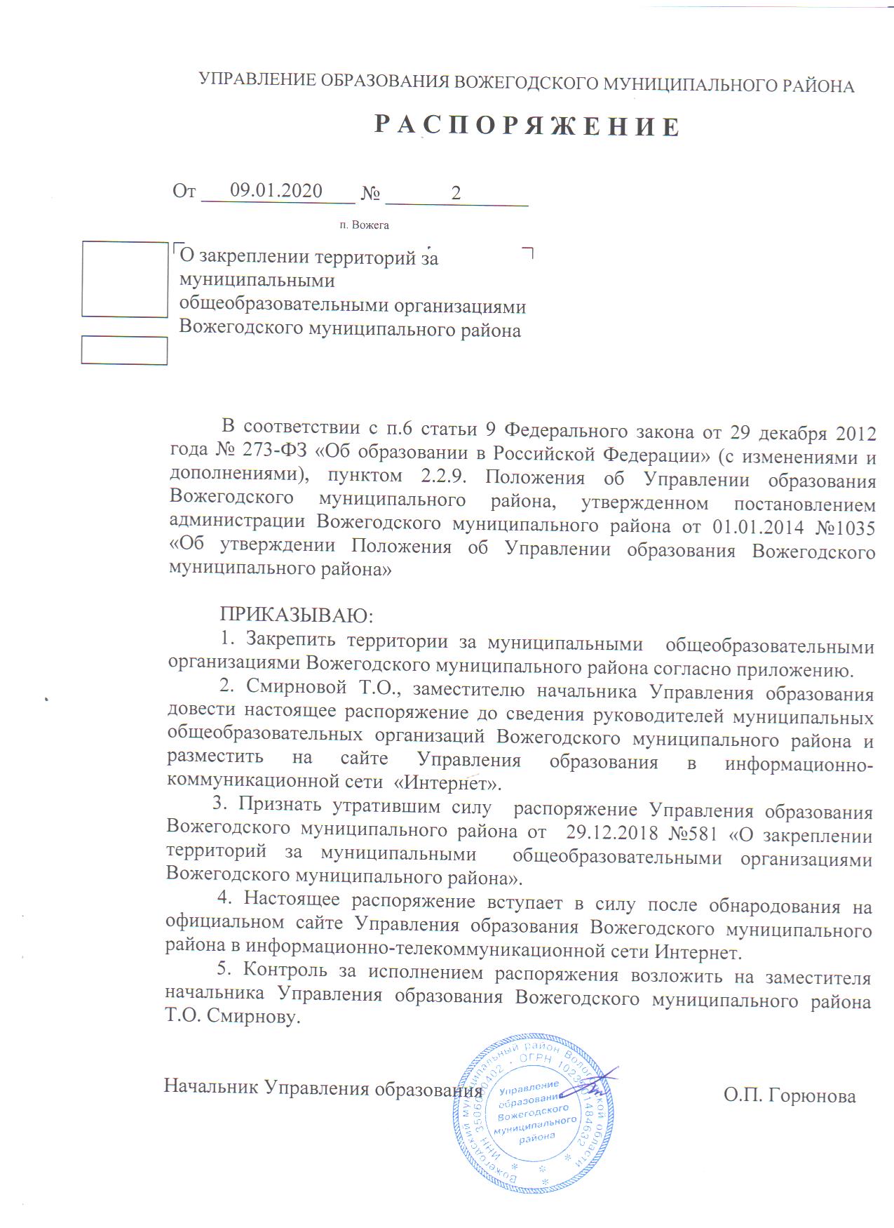 Распоряжение от 09.01.2020 № 2 "О закреплении территории"