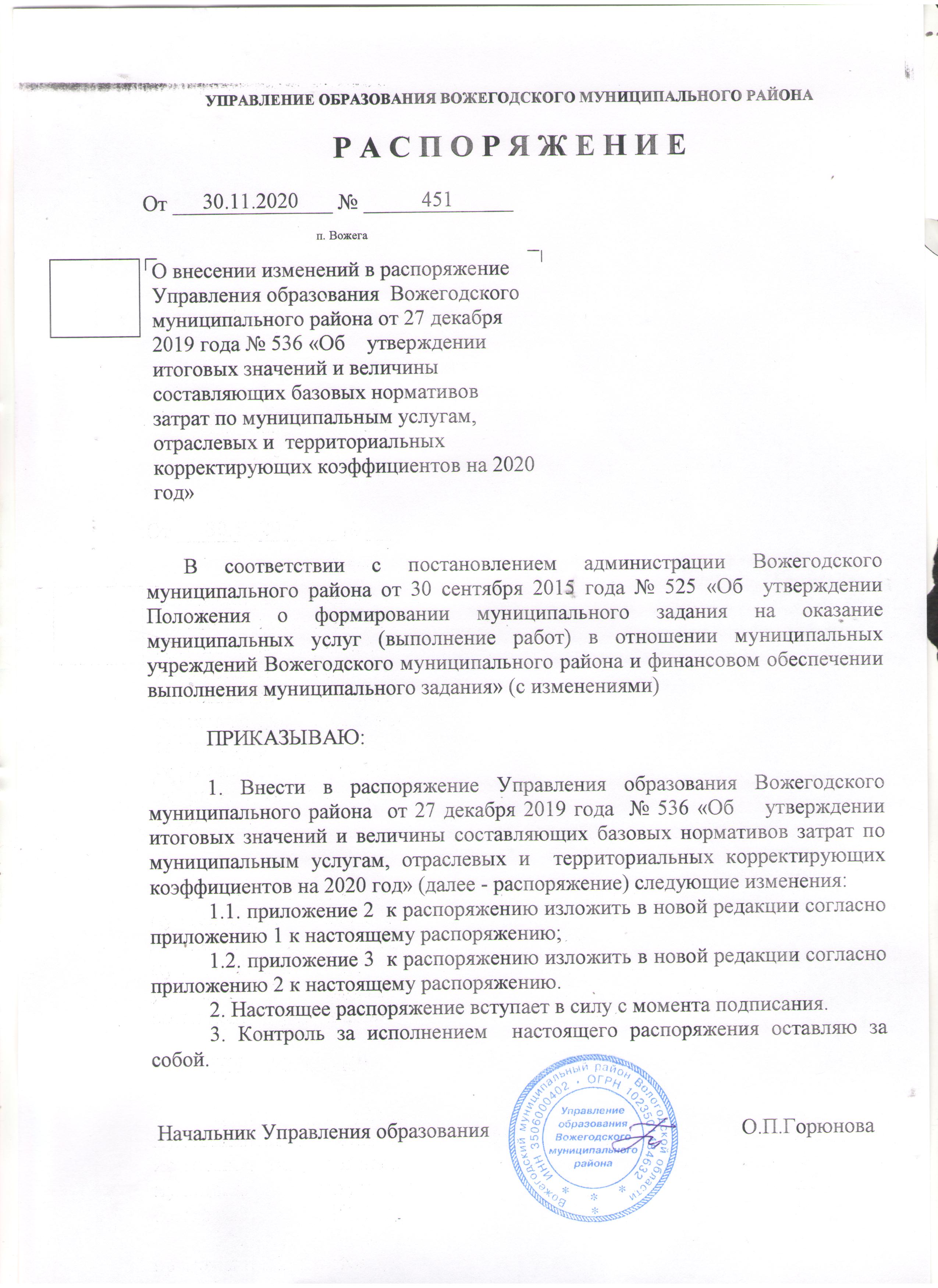 Распоряжение от 30.11.2020 №451 О внесении изменений