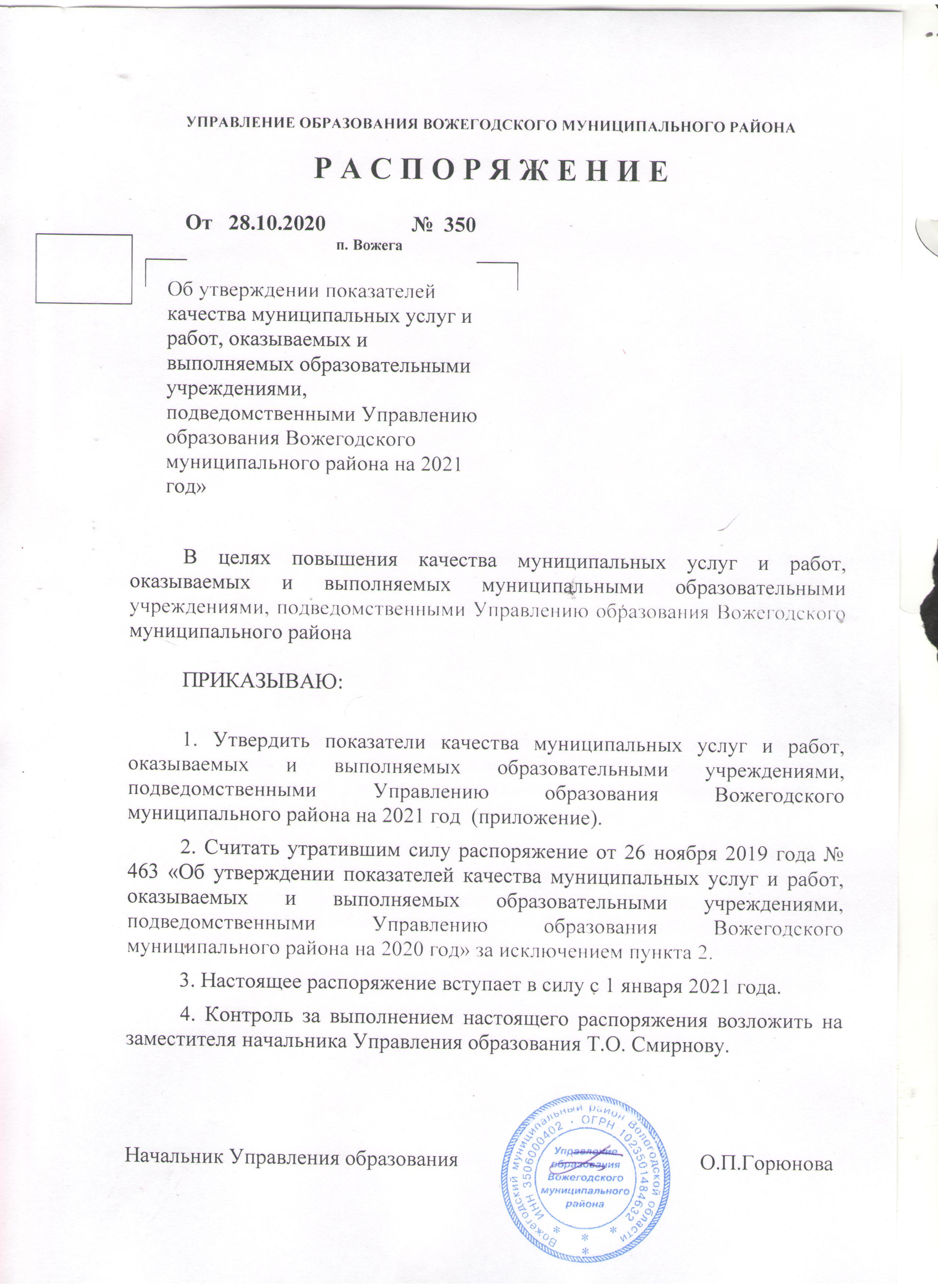 Распоряжение от 28.10.2020 № 350 "Об утверждении показателей качества муниципальных услуг" 2021