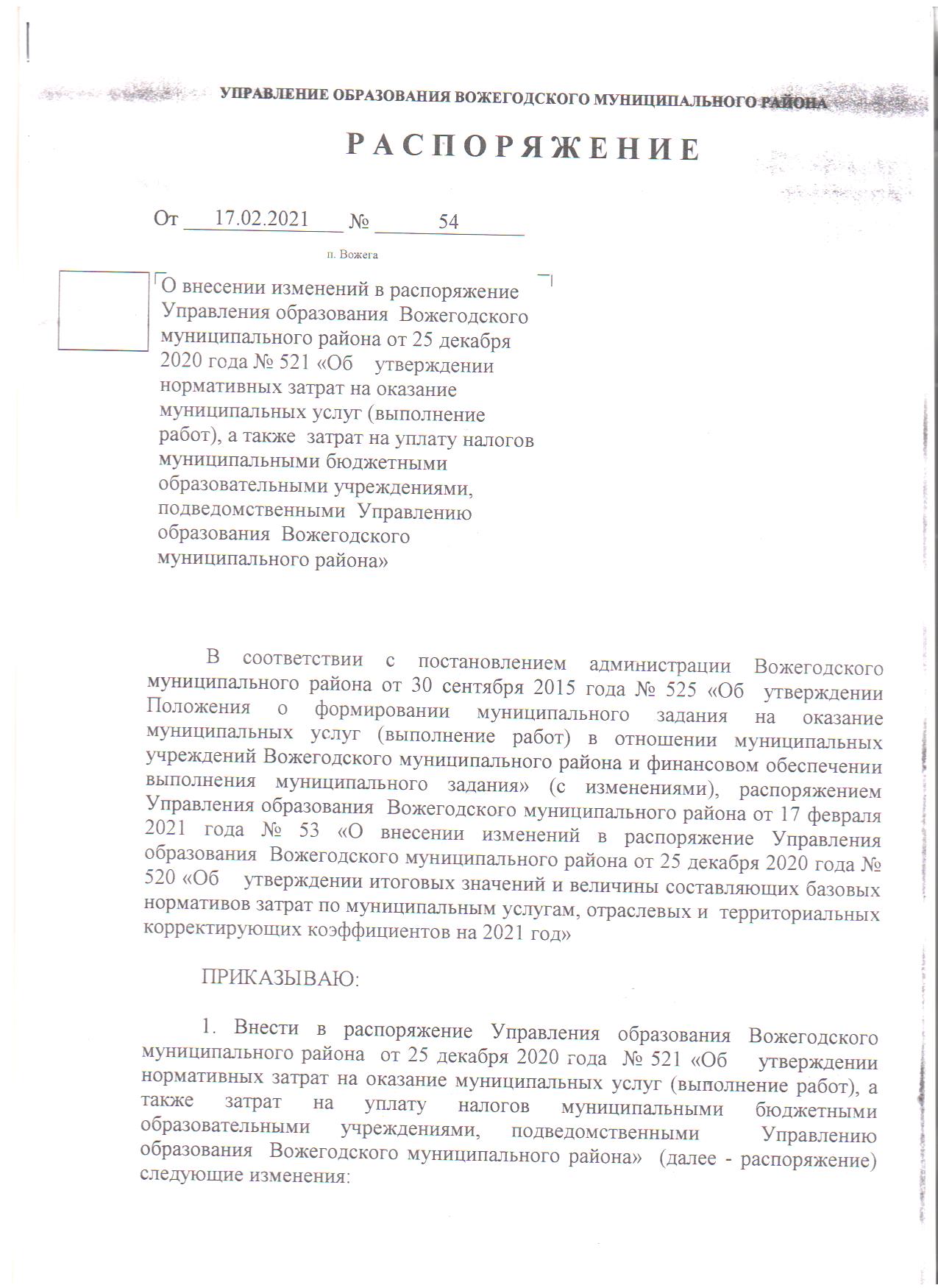 Распоряжение от 17.02.2021 № 54
