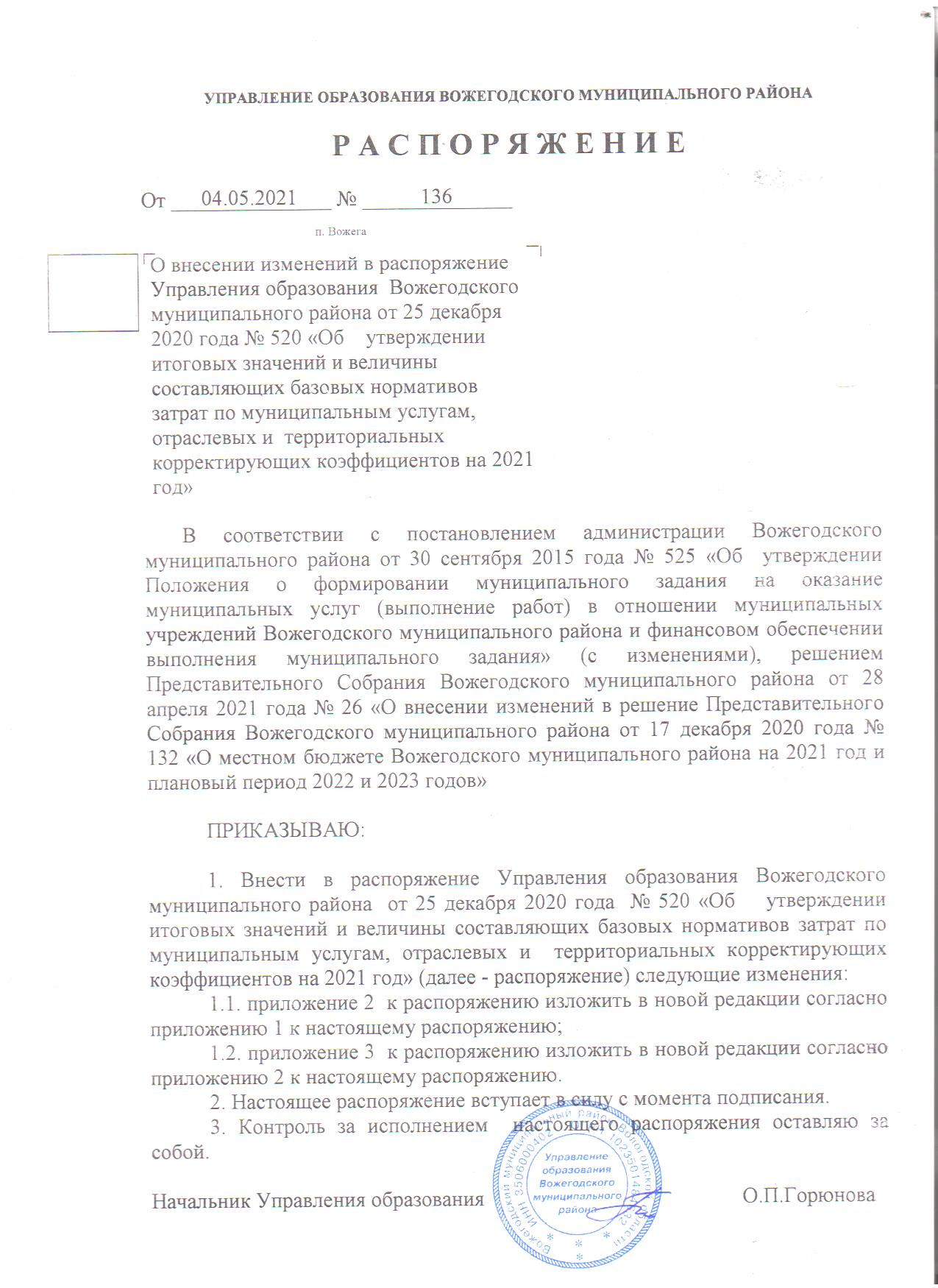 Распоряжение от 04.05.2021 №136