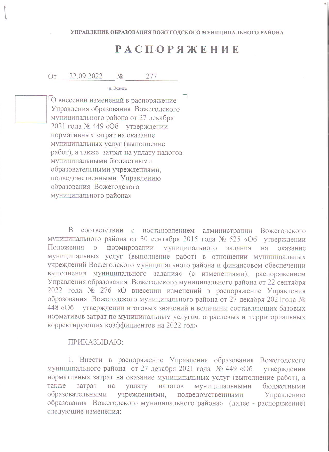 Распоряжение 277 от 22.06.2022