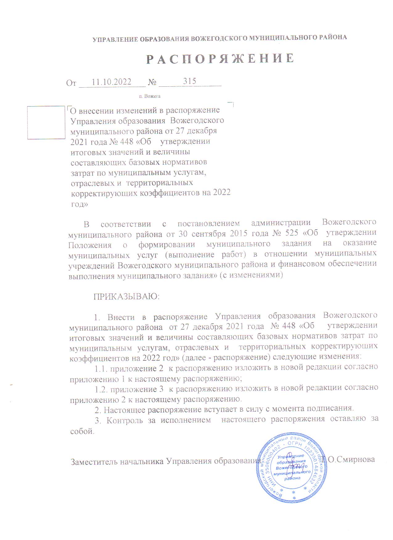 Распоряжение 315 от 11.10.2022