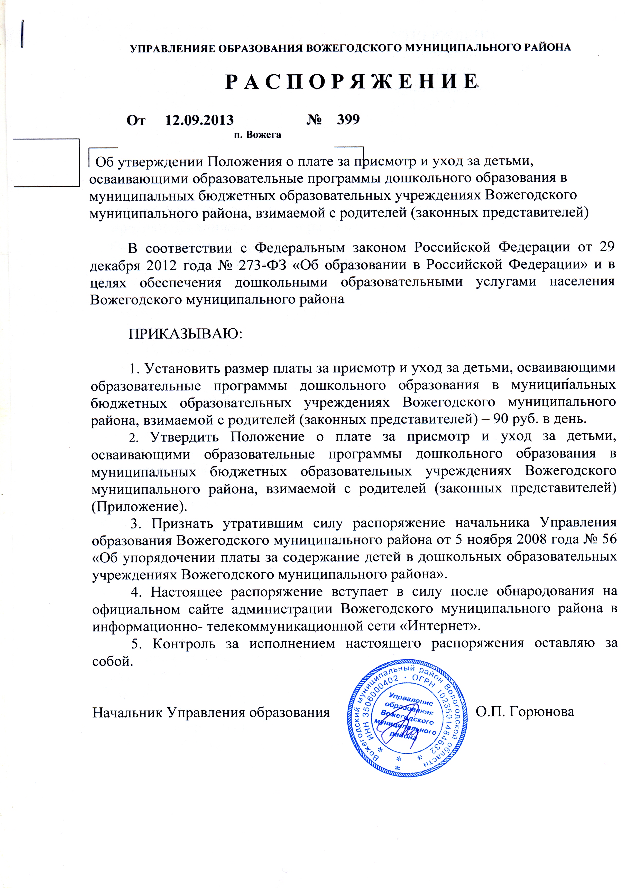 о плате за присмотр и уход за детьми, осваивающими образовательные программы дошкольного образования в муниципальных бюджетных образовательных учреждениях Вожегодского муниципального района, взимаемой с родителей (законных представителей).