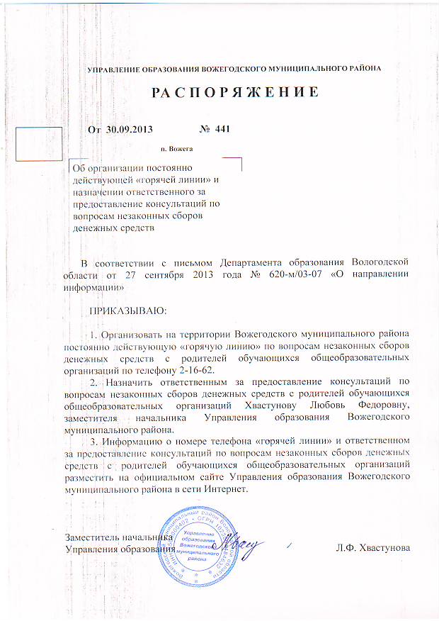Распоряжение №441 от 30.09.2013 г. "Об организации постоянно действующей "горячей линии" и назначении ответственного по вопросам незаконных сборов денежных средств