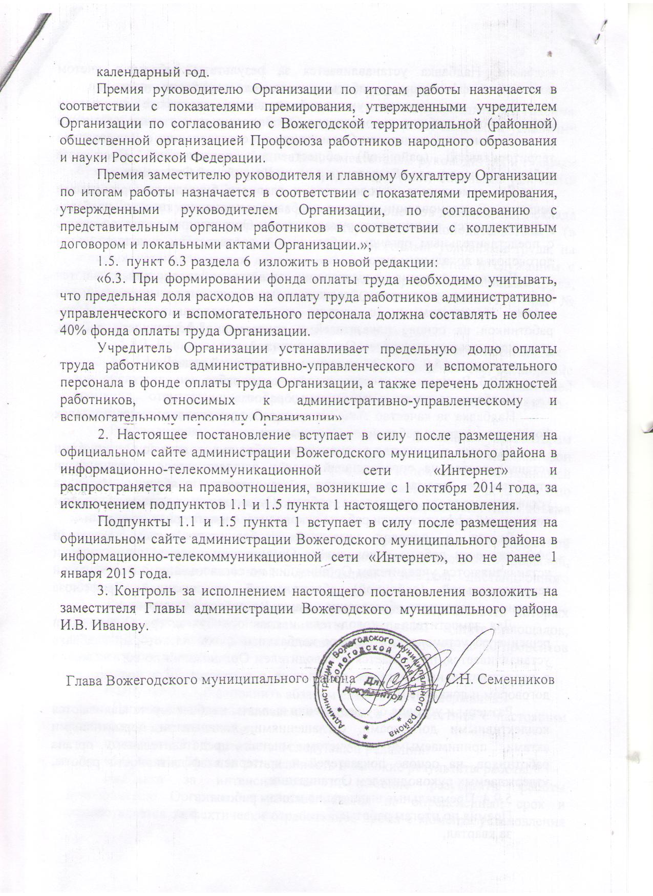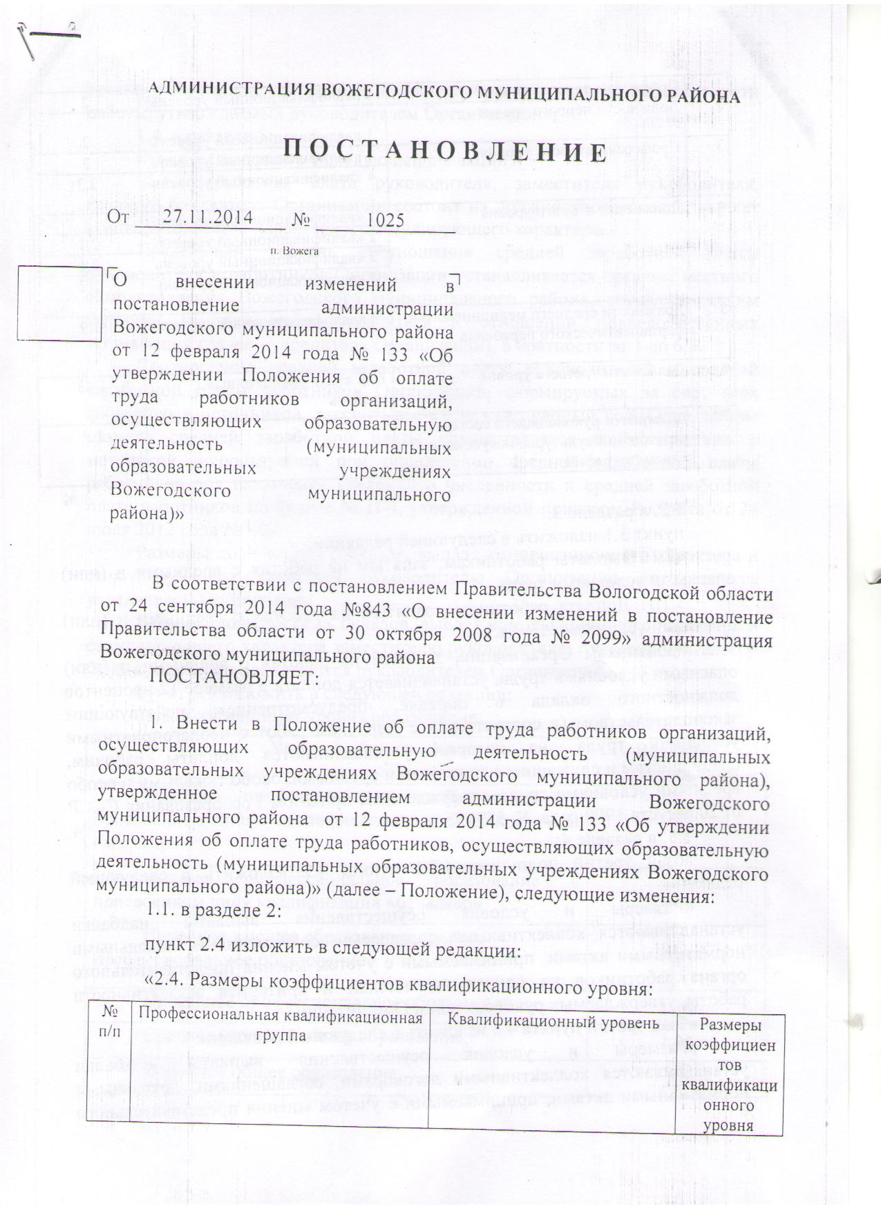 О внесении изменений в постановление администрации Вожегодского муниципального района от 12.02.2014 №133 "Об утверждении Положения об оплате труда работников организаций, осуществляющих образовательную деятельность (муниципальных образовательных учреждений Вожегодского муниципального района)"