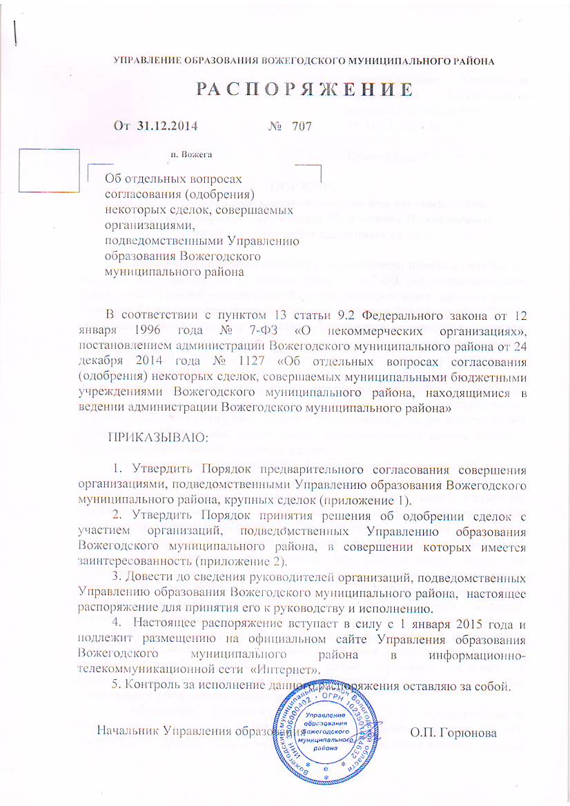 ПОРЯДОК предварительного согласования совершения организациями, подведомственными Управлению образования Вожегодского муниципального района, крупных сделок
