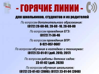 «По вопросам документационной нагрузки педагогических работников и несоблюдения введенных ограничений педагоги Вологодской области могут обратиться на «горячую линию» Департамента образования Вологодской области по телефону (8172) 23-01-03 (доб. 2053, 2046) с понедельника по пятницу, с 8:00 до 17:00 (перерыв с 12:30 до 13:30). Все поступившие обращения будут рассмотрены Управлением контроля и надзора в сфере образования».