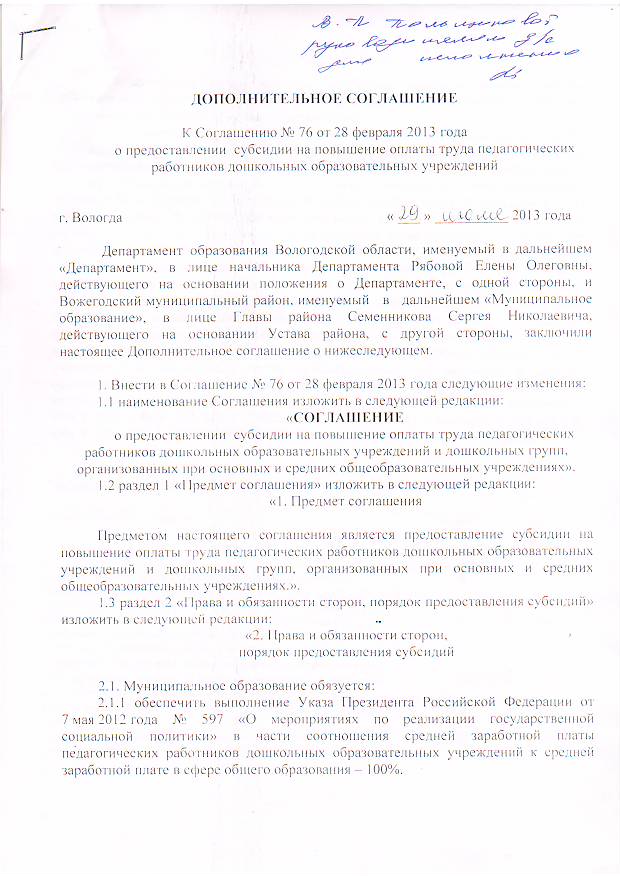 Дополнительное соглашение к Соглашению №76 от 28 февраля 2013 года о предоставлении субсидии на повышение оплаты труда педагогических педагогических работников дошкольных образовательных учреждений
